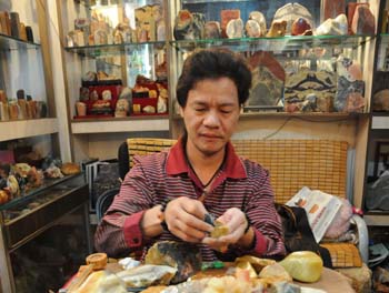 福州左海藝術(shù)村一家壽山石店的店主在用細(xì)砂紙打磨原石,他經(jīng)常購(gòu)進(jìn)大批原石,經(jīng)簡(jiǎn)單加工后出售就能賺取高額利潤(rùn)。記者 來(lái)建強(qiáng)/攝 |