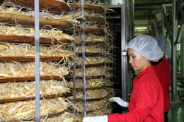 戴上頭套和腳套,我們懷著好奇的心情走進(jìn)工廠,一一觀看各道生產(chǎn)工序。天然的人參經(jīng)由機(jī)器清洗后,通過(guò)傳送帶被送至蒸箱,完成了最關(guān)鍵最核心的蒸參環(huán)節(jié)后,顏色變紅,又通過(guò)傳送帶,被碼放到曬盤。自然晾曬20多天后,再由有經(jīng)驗(yàn)的工人手工篩選,分為天、地、良三種級(jí)別。其中,天字號(hào)紅參為頂級(jí),是上等的國(guó)禮,據(jù)說(shuō)在1995年中國(guó)國(guó)家主席訪問(wèn)韓國(guó)時(shí),韓國(guó)贈(zèng)送了10支“天參”。