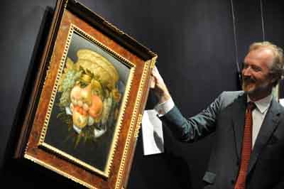 圖為預(yù)展上展示的2012年1月25日將在紐約佳士得拍賣會(huì)上拍賣的朱塞佩·阿爾欽博托的油畫《以水果構(gòu)成的可逆轉(zhuǎn)男子肖像》,估價(jià)300萬至500萬美元。