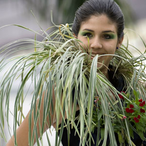 在哥倫比亞卡利市舉行的生態(tài)時裝展上,一名模特展示設計師作品。據(jù)悉,本次時裝展上展出的所有服裝都是用天然材料和活植物制作的。