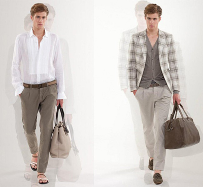 從Fendi近日釋出的2012春夏男裝圖冊可見,在全新一季的發(fā)售款式上,褲款以九分褲為新趨勢,搭配開襟衫、襯衫與西裝等各種風(fēng)格,可正式也可休閑的多樣穿搭。一向以定制時裝見長的奢華品牌Fendi,本季男裝以輕松的粉色系搭配丹寧與卡其色系,勾勒出全新的Fendi風(fēng)格。 同時,本次大片由Karl Lagerfeld掌鏡,老佛爺以“靈魂出竅”的趣味手法表現(xiàn)出Fendi的全新時裝世界。