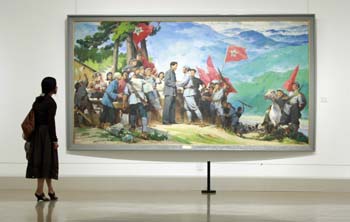 中國美術館展出的中央美院教授、中國畫壇著名畫家林崗的著名油畫作品《井岡山會師》。記者 任正來/攝 |