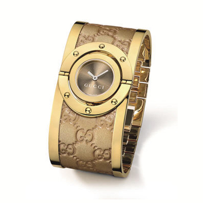 一旦表面轉(zhuǎn)到手鐲形式,表塊背面的細(xì)節(jié)設(shè)計(jì)就出現(xiàn)了——GG式樣和黃色PVD,設(shè)計(jì)的風(fēng)格是融合Guccissima皮革。