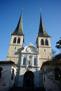 霍夫教堂是盧塞恩最重要的主座教堂,也是瑞士最具代表性的文藝復(fù)興風(fēng)格教堂。教堂的外觀非常特別,兩棟塔尖與塔身幾乎等長的灰色尖塔,是典型的哥特式建筑,中間卻夾著裝飾花哨的白色文藝復(fù)興式墻面,原來這棟教堂的前身是建于8世紀(jì)的本篤會修道院,1633年被大火燒毀后只剩下兩根尖塔,于是又與1645年重建成文藝復(fù)興的風(fēng)格。