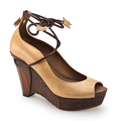 UGG Australia 2012春夏意大利高端手工系列女鞋嚴(yán)選意大利珍貴鮭魚皮、鴕鳥皮、珍珠魚皮,以及蕾絲圖案美利奴羊毛皮等材質(zhì)為鞋面,全手工制作完成。中跟、坡跟混搭防水臺(tái)的設(shè)計(jì)使這個(gè)系列的高跟鞋每一款都足夠舒適實(shí)穿,配合中和色彩的鞋面搭配任何服裝也都游刃有余。
