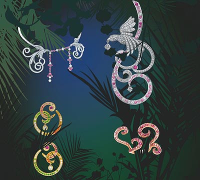珍愛之鳥”系列珠寶。 修長的線條、豐滿的羽毛、細致復雜的卷曲花紋、令人目炫的罕貴彩色寶石,讓神話幻化成浪漫永恒,在強烈的動感中展現(xiàn)Van Cleef