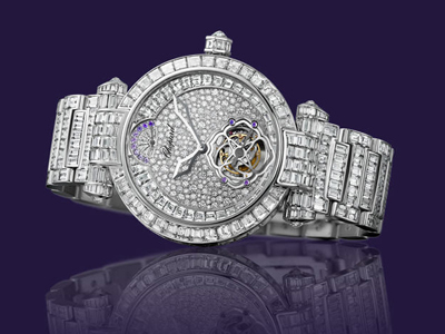 陀飛輪腕表滿足瑞士官方天文臺認證的所有苛刻要求。腕表具備時、分顯示,位于6時位置的一分鐘陀飛輪設(shè)小秒針顯示,12時位置設(shè)有鑲嵌長方形切割鉆石和紫水晶的拱形動力儲存顯示功能。 雪花鑲嵌法 18K白金表盤運用雪花鑲嵌法,使用不同直徑的明亮式切割鉆石進行鑲嵌,是一種極難掌握的鑲嵌工藝,同時以長方形切割鉆石相環(huán)繞,動力儲存顯示采用紫水晶鑲嵌刻度。白金表冠鑲嵌長方形和水滴形切割鉆石。表圈、表耳和表帶則鑲嵌橢圓形蛋面切割鉆石、長方形切割鉆石。6時位置陀飛輪表橋采用