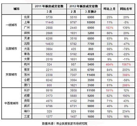 據(jù)偉業(yè)我愛我家市場研究院的數(shù)據(jù)統(tǒng)計,3月份,新房成交量環(huán)比漲幅前三的城市分別是杭州上漲464%,長沙上漲191%,廣州上漲183%;新房成交量同比漲幅前三的城市分別是杭州上漲1567%,蘇州上漲388%,廈門上漲288%。杭州的新房成交量漲幅不管是環(huán)比今年2月份,還是與去年同期相比,漲幅均領(lǐng)跑全國。