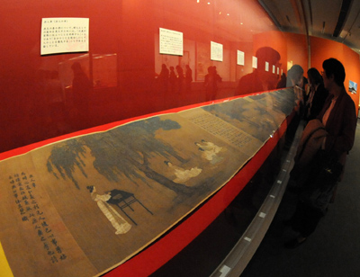 3月28日,在日本東京富士美術(shù)館,參觀者在觀看故宮收藏的中國(guó)國(guó)家一級(jí)文物南宋《女孝經(jīng)圖》。