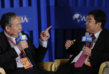 4月3日,中國國際經(jīng)濟交流中心常務(wù)副理事長鄭立新(左)、長江商學(xué)院副院長劉勁在辯論會上(拼版照片)。 當(dāng)日,博鰲亞洲論壇舉行電視辯論,嘉賓們圍繞“2012中國房地產(chǎn)大變革”這一議題展開討論。記者