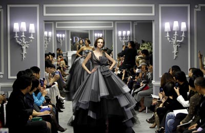 日前,眾多中外名流、明星、時(shí)尚界人士云集上海外灘“羅斯福公館”,觀看由迪奧女裝工坊首席設(shè)計(jì)師比爾·蓋特領(lǐng)銜設(shè)計(jì)的2012春夏高級訂制時(shí)裝秀。圖為模特在演繹迪奧的高級訂制時(shí)裝。