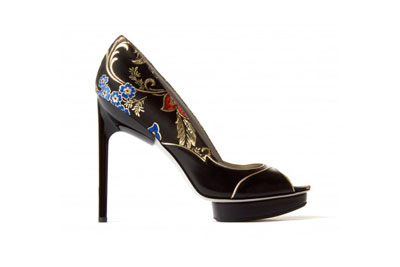 Wu(吳季剛)發(fā)布最新2012秋冬系列鞋履,本季設(shè)計師帶來濃厚的東方色彩,西方的高跟鞋型,配上黑底鮮色刺繡,如東方女性的韻味般盡現(xiàn)人前。再來就是織錦,金珠的設(shè)計,將高貴與華風混而為一。