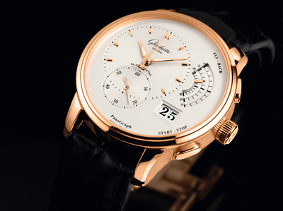 新的設(shè)計(jì)理念中青睞于采用更大的圓形表殼,在表盤左側(cè)是交互的小時(shí)/分鐘表盤和小秒針盤,格拉蘇蒂大日期顯示和以往款式一樣位于四點(diǎn)的時(shí)刻引人注目。該款腕表非凡的三十分鐘飛返計(jì)時(shí)功能采用三個(gè)每十分鐘的刻度和三個(gè)單獨(dú)的指針,以現(xiàn)代潮流全新演繹原來(lái)的設(shè)計(jì)。