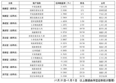 華寶證券統(tǒng)計,4月27日-5月8日,投連險各賬戶跟隨市場穩(wěn)步上漲,整體取得1.42%的平均收益。絕大部分賬戶實現(xiàn)正收益。