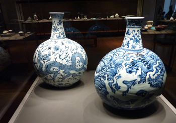 這里有大清帝國乾隆皇帝御案上的純金擺設(shè)——一座天圓地方的宮廷建筑模型,足有數(shù)公斤重。它像一個(gè)“俘虜”,早已沒有了當(dāng)年在皇帝身邊的那股威風(fēng);這里有元代和明代的青花瓷,還有潔白如玉的白瓷,站在它們面前,仿佛感到中秋明月在照耀,清澈見底的秋水在流淌。還有“宰相劉羅鍋”——?jiǎng)④哪珜,還有大肚彌勒、千手觀音、金銀珠寶、歷代錢幣……而且,據(jù)說這里展出的只是館藏文物的一部分,還有很多極其寶貴的文物藏而未露。