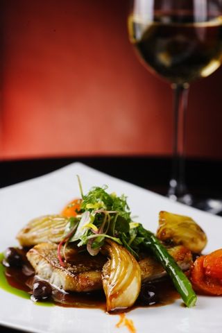 微煎海鱸魚菲力配四川胡椒和西班牙式西紅柿泥佐小茴香佐普羅旺斯橄欖油
