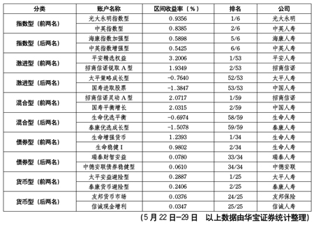 根據(jù)華寶證券統(tǒng)計,5月22日-5月29日,投連險各賬戶普遍跟隨大盤取得正收益,各投連險賬戶平均區(qū)間收益為0.47%。然而,仍有5%的賬戶區(qū)間實現(xiàn)負收益,其中泰康人壽旗下的泰康優(yōu)選成長型賬戶以-1.5078%的區(qū)間收益率在所有納入統(tǒng)計的177個投連險賬戶中墊底。