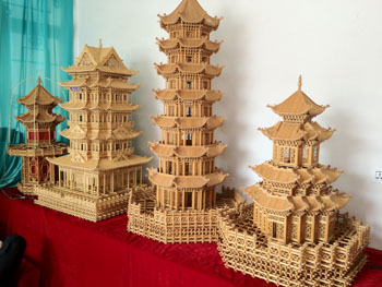 走進(jìn)徐老漢家的客廳,里面儼然一個(gè)中國(guó)古代著名建筑微型展覽室,故宮角樓、天安門城樓、滕王閣、黃鶴樓等,老人說(shuō),這些古代建筑他只要能夠到現(xiàn)場(chǎng)看上幾眼,就能用高粱稈扎刻出來(lái)。