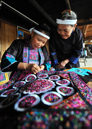 廣西三江侗族自治縣同樂苗族鄉(xiāng)同樂村的“侗族刺繡”藝人在做刺繡。記者