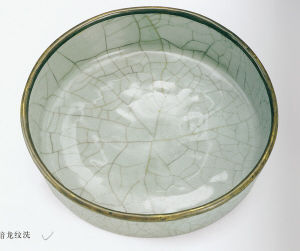 厘米,足徑12.3厘米。洗壁垂直微向外撇,平底,圈足寬而淺。通體灰青色釉,青翠如玉,釉汁肥厚凝重,釉面布滿了自然天成、縱橫交錯的開片。洗口部鑲銅口,圈足露胎呈褐色,紫口鐵足的特征十分明顯。洗內(nèi)底印有一條蒼龍,其形象矯健勇猛,筆觸細(xì)微,但由于釉汁太厚,只有高光下才能顯現(xiàn),更增添了“神龍見首不見尾”的神秘之感。此洗釉色純正,造型古樸、大方,為官窯典型器物,并且印有龍紋,較為罕見!吨袊沾砂l(fā)展史》一書記載過這種官窯洗,故宮博物院也收藏了這樣一件洗子,深受清代皇室喜愛,器底刻有乾隆御題詩,可見其珍貴。