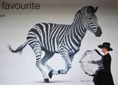 在英國(guó)伯克郡,一名準(zhǔn)備前往皇家阿斯科特賽馬會(huì)的女士走過(guò)一幅畫有斑馬的廣告牌。
