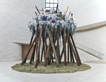 在惠特沃思藝術館展出的作品中,著名喀麥隆藝術家帕斯卡爾·馬丁·泰尤專門為本次藝術展創(chuàng)作的大型室內雨林作品《世界分崩離析》,將傳統(tǒng)非洲雕塑和象征物質財富的日常雜物有機組合,模糊了貿易商品同神圣事物之間的區(qū)別和邊界,體現(xiàn)了作者在世界經(jīng)濟文化交流的背景下,對非洲社會、傳統(tǒng)文化和生活造成影響的思考與困惑。