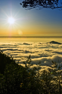 日出或薄暮天氣晴朗而有浮云時(shí),阿里山經(jīng)常出現(xiàn)景色壯麗的云海。登上山頂平臺(tái),放眼遠(yuǎn)眺,白云從山谷涌起,迎風(fēng)飄蕩,時(shí)而如汪洋一片,淹沒千山萬嶺,露在云海上的峰類、樹木好像一座座浮嶼;時(shí)而如大地鋪絮,足下白茫茫一片;時(shí)而如山谷堆雪,林海中山頭若隱若現(xiàn),頗似海市蜃樓。若是晴天,落日的萬道金光照射在云海上,閃耀出千萬種色彩,茶色、杏黃、寶藍(lán)、艷紅、碧綠等變幻無窮,更顯神秘。