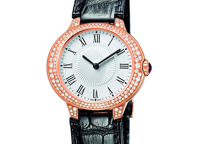 Regina)將流暢的造型與精美細(xì)致的輪廓相融合,堪稱跨越時(shí)間之典藏之作:整體造型以時(shí)尚橢圓包含圓形表盤(pán),新意頓生,突顯現(xiàn)代風(fēng)范。表盤(pán)外圈以18K玫瑰金搭配頂級(jí)鉆石,雙曲線設(shè)計(jì),以流動(dòng)感十足的漸變線條環(huán)繞夢(mèng)幻計(jì)時(shí),大氣之中不乏巧思,令其成為眾人矚目的焦點(diǎn)。表盤(pán)外圈采用雪花鑲嵌的獨(dú)特技法,每顆美鉆均獨(dú)一無(wú)二,經(jīng)工匠們的巧手,如點(diǎn)點(diǎn)繁星,溫柔墜落于表盤(pán)之上,匯聚成宛若銀河般流動(dòng)曲線,盤(pán)繞腕間,環(huán)聚中心表盤(pán),賦予整體設(shè)計(jì)無(wú)限浪漫詩(shī)意。簡(jiǎn)約指針在其上徐徐轉(zhuǎn)動(dòng),更增添典雅迷人的華貴風(fēng)情。更配以鱷魚(yú)皮表帶,令腕表散發(fā)出典雅尊貴的奢華氣息。