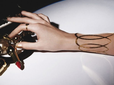 Dior(迪奧)品牌2012圣誕限量彩妝Grand Bal系列推出了一款24K金紋身貼紙?zhí)籽b,其中包括戒指、手鏈、臂環(huán)等印有Dior標志的圖案。由Dior珠寶設(shè)計師Camille Miceli操刀設(shè)計,每套售價120美元,合約750元人民幣。