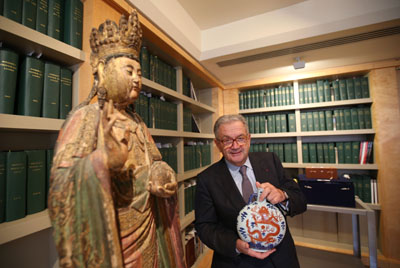 圖為英國古董商朱塞佩·埃斯凱納齊在倫敦埃斯凱納齊古董行展示中國清代瓷器。