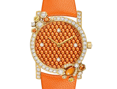 這個(gè)高尚的隱喻為珍貴腕表的創(chuàng)作注入靈感,表盤(pán)上的耀眼寶石更顯設(shè)計(jì)的精美。華麗的黃金和閃爍的凸圓形橙色藍(lán)寶石,凸顯蜂巢的明媚色澤和豐滿(mǎn)形狀,再加上蜜蜂和蜂巢圖案與防反光處理的弧形藍(lán)寶石水晶組成的表殼,保護(hù)著鑲嵌珠寶的表盤(pán),將蜂巢與蜜蜂的生動(dòng)靈韻演繹至極。優(yōu)雅的外表下是另一份結(jié)合巴黎式浪漫的嚴(yán)謹(jǐn)工藝創(chuàng)作:瑞士自動(dòng)上鏈機(jī)械機(jī)芯擁有40個(gè)小時(shí)的動(dòng)力儲(chǔ)存能力,并由20顆寶石軸承組成,透過(guò)藍(lán)寶石水晶鏤空表底蓋,可以在擺輪刻上發(fā)現(xiàn)蜂巢的圖案。在精致設(shè)計(jì)與精湛工藝的背后,暗藏著的是Chaumet