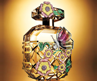 Fantasy。香水瓶上有黃金、鉆石、紅藍(lán)寶石的鑲嵌,更配以一只躍躍欲飛的金蝴蝶,令整瓶香水看上去就像是每個(gè)女人心中的秘密花園,充滿百香果,牡丹和蘭花的氣息。