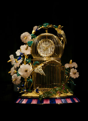香港蘇富比藝術(shù)空間當日預(yù)先展出多件展品,其中百達翡麗的“金貝與珍珠”和“喜鵲聚寶鳥巢”兩件座枱鐘,卡地亞“火鶴與蓮花”機械座枱鐘最受矚目。