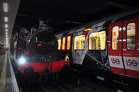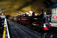 隨著夜色中的一聲汽笛,一輛19世紀蒸汽機車拉著維多利亞時代的木制車廂駛?cè)雮惗氐罔F穆爾蓋特車站,白色蒸汽從紅色車頭上冒出來,煤氣味在空中彌漫,這一幕似乎把人們帶回到了1863年。那一年1月9日,倫敦開通了世上第一條地鐵線路。