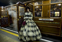 演員身著舊式服裝站在曾在19世紀運送旅客的站臺上拍照,紀念倫敦地鐵成立150周年。新華社/EPA歐新 |