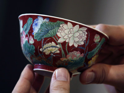 香港2013春拍上一件清康熙御制胭脂紅地琺瑯彩蓮花圖碗經(jīng)11口叫價以7400萬港元成交(約合950萬美元),刷新清康熙瓷器拍賣紀錄。