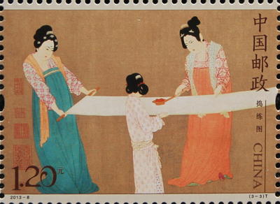 當(dāng)日,由中國郵政發(fā)行的唐代名畫《搗練圖》特種郵票一套三枚及小型張一枚在全國正式發(fā)行,總面值9.60元。該套郵票以原畫作品為藍本,由中國著名郵票設(shè)計師王虎鳴擔(dān)綱設(shè)計,以簡約明快的表現(xiàn)手法突出了古畫的韻味。小型張采用扁長票幅,邊飾古香古色,在方寸間充分表現(xiàn)了原畫的神韻。