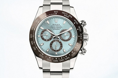 Daytona腕表。此新款腕表配備獨有的冰藍色表面和栗啡色Cerachrom陶質(zhì)字圈,使此腕表著名的時速計外圈格外矚目。