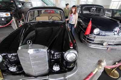 5月29日,參觀者在山東省濰坊市一“老爺車收藏基地”參觀奔馳牌老爺車。