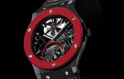 Watch摩納哥紅致敬——HUBLOT宇舶表全球首創(chuàng)明亮的彩色陶瓷材質(zhì),呈獻(xiàn)與黑色或白色陶瓷一樣高質(zhì)的亮紅色陶瓷腕表“紅與黑鏤空陀飛輪”,也是一項申請國際專利的腕表。
