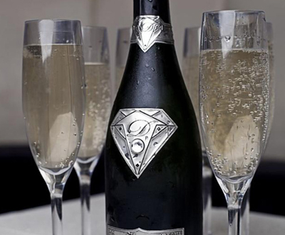 Diamants的香檳酒商出品的這瓶香檳上,它那形似超人標志的商標用18金打造而成,正中鑲有一顆重達19克拉的璀璨無瑕的白鉆,代替該品牌平時使用的施華洛世奇水晶。