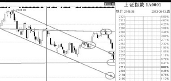 滬市大盤的4日均線(2000.55點(diǎn))向上移動對股指構(gòu)成頂托;10日均線暫時成向下運(yùn)行趨勢,對收在上方的股指具有向下反作用力;股指在頂托力與反作用力的對沖之下,將出現(xiàn)上下震蕩走勢。因此,筆者認(rèn)為周五大盤股指會先向上小幅拉高,再向下回抽5日和10日均線。