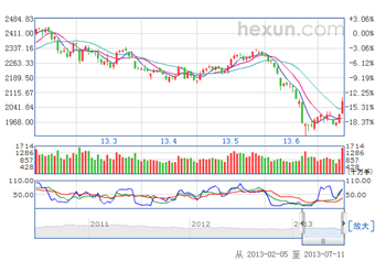 判斷大盤震蕩上行的依據(jù)并不是在于政策面出現(xiàn)了一些趨好的跡象,主要是基于大盤的技術(shù)走勢。例如在6月25號,大盤在跌破解放底之后,突然加速下跌,下探1849點(diǎn),如此瘋狂的空頭觸動了監(jiān)管層的政策紅線,立即有大資金把大盤硬硬地托回到1949點(diǎn)之上的1959點(diǎn),這十分明顯地向市場表明1949點(diǎn)就是政策底,所以大盤在該點(diǎn)位震蕩可以,打滾可以,橫行可以,但不能再次下行,這就是判斷近期大盤的主要參照點(diǎn)。