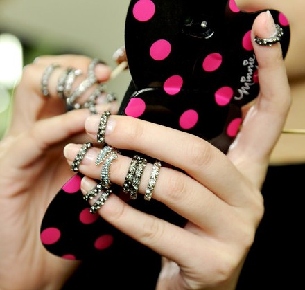 秀場(chǎng)的模特兒們修剪整齊,素淨(jìng)的指甲上,扣著設(shè)計(jì)簡(jiǎn)單卻閃耀的指環(huán),這個(gè)迷人的設(shè)計(jì)細(xì)節(jié),無(wú)論對(duì)于飾品市場(chǎng)還是指甲藝術(shù)都是一大創(chuàng)舉,從手指底部、關(guān)節(jié)間、到指甲,一氣呵成的指環(huán)裝飾,帶點(diǎn)華麗的搖滾風(fēng)格,同時(shí)又那麼奢華大氣。