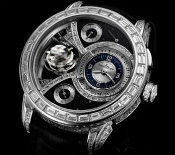 Blue深藍(lán)雙翼立體雙軸陀飛輪腕表,表殼外圈鑲嵌長方形切割鉆石,并搭配深藍(lán)色的表盤。