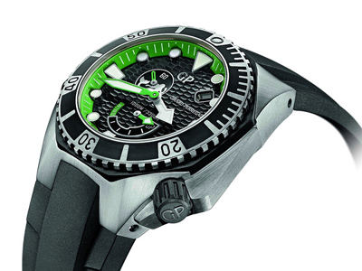 Rockefeller攜手合作設(shè)計(jì),以代表大自然的綠色為主題,表背有美人魚(yú)雕刻圖案點(diǎn)綴,以示雙方對(duì)保護(hù)海洋資源的目標(biāo)。