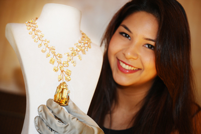 高級(jí)珠寶商懋琬為10月11日至15日舉行的新加坡珠寶節(jié)向媒體展示鉆石項(xiàng)鏈,項(xiàng)鏈墜為重達(dá)407.48克拉的天然黃鉆“無(wú)與倫比”。