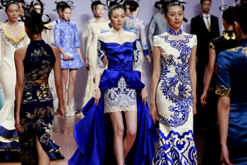 T臺(tái)的燈光漸暗下來(lái),伴隨著蒙古民族的“呼麥”,20位舞者以彎弓射大雕的姿態(tài)將觀者帶到了縱馬馳疆的時(shí)代,蓬勃的氣勢(shì)讓人久久回味;燈光亮起,60位身著新一季高級(jí)定制服裝的男女模特從北京元朝建都標(biāo)志之一的景德街牌樓下走來(lái),舉手投足間,以現(xiàn)代的方式演繹著大元盛世的絢爛。