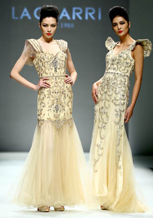 以“刺”為發(fā)布主題的“胡社光高級(jí)定制時(shí)裝發(fā)布會(huì)”日前在北京舉行,圖為模特在展示設(shè)計(jì)師胡社光的時(shí)裝作品。