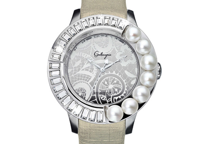 Collection弦美珍珠」系列腕表,以玲瓏立體的珍珠為主角,配以Galtiscopio迦堤招牌「GP